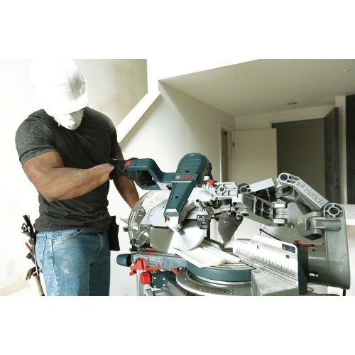 Kapp- und Gehrungssäge GCM 10 GDJ, Die Kapp- und Gehrungssäge GCM 10 GDJ Professional vereint Leistung auf dem neuesten Stand der Technik mit einem revolutionärem Design. Das Axial-Glide™-System von Bosch gewährleistet dauerhafte Präzision und sanftes Gleiten, sogar bei der Arbeit auf beengtem Raum. Sicher und komfortabel: Neigungseinstellung an der Vorderseite gewährleistet schnelles und einfaches Einstellen ohne das Risiko, hinter die Säge greifen zu müssen. Der Kopf kann in der Kappschnittposition fixiert werden für maximale Kappschnittkapazität. Diese Säge eignet sich ideal für die Verwendung bei hartem und weichem Holz, Holzverbundstoffen, MDF-Platten sowie Konstruktionsholz und ist die perfekte Wahl für alle Zuschnittarbeiten in Bereichen wie Zimmerei, Umbau, Fenstereinbau und Schrankbau. Die Säge ist mit den folgenden Arbeitstischen kompatibel: GTA 2500 Compact, GTA 2500 W, GTA 2600 und GTA 380 Die GCM 10 GDJ Professional bietet außerdem eine große, gut ablesbare Neigungs-/Gehrungsskala sowie große Anschläge und gefräste Winkel für eine optimale Materialstütze. 1 x Kreissägeblatt, Expert for Wood, 254 x 30 x 2,4 mm, 60 (2 608 642 530); Klemme (1 609 B06 203); Staubsack (ET-Nr. 1 609 B00 506)