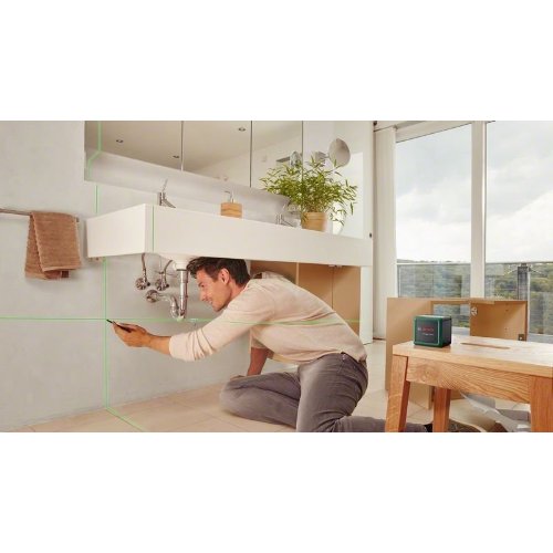 Kreuzlinien-Laser Quigo Green. Grünes Licht für deine Ideen! Grüne Lasertechnologie für bis zu viermal bessere Sichtbarkeit als mit roten Laserlinien, selbst bei hellen Lichtverhältnissen. Verbesserte Genauigkeit von +/- 0,6 mm/m und Arbeitsbereich von bis zu 12 m. Recyclingmaterialien in Produkt und Verpackung sowie optimierter Stromverbrauch tragen zur Nachhaltigkeit bei. Einfaches Positionieren mit Adapterplatte und Universalklemme MM 2. Perfekt zum Aufhängen von Bildern, für Fliesenarbeiten, zum Montieren von Gardinenstangen und für die Installation von Küchenmöbeln. Im Lieferumfang enthalten: Batterien 2x 1,5-V-LR03 (AAA), Universalklemme MM2 (0 603 692 201), Schnellmontage-Adapter, Karton
