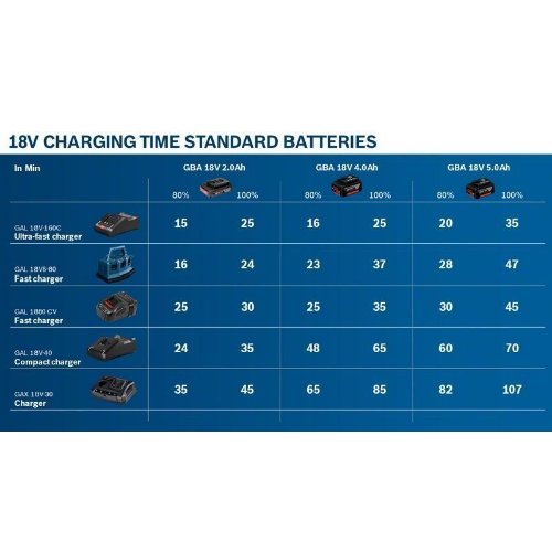 Ladegerät GAL 18V-40. Das GAL 18V-40 bietet ein modernes Design und ist extrem kompakt. Mit einem Ladestrom von 4 A lädt es einen GBA 18V 4.0Ah-Akku in nur 48 Minuten bis zu 80% und einen GBA 18V 2.0Ah-Akku in 24 Minuten bis zu 80%. Dieses kompakte Ladegerät ist Teil des Bosch Professional 18V Systems und ist vollständig kompatibel mit allen Bosch Professional 18V-Akkus. Das GAL 18V-40 kann auch an der Wand montiert werden. Im Lieferumfang enthalten: Karton, Schnellladegerät GAL 18V-40 Professional (1 600 A01 9RJ)