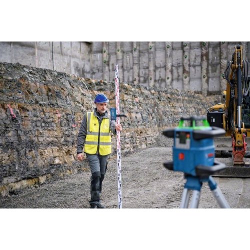 Laser-Empfänger LR 65 G. Der kompakte und robuste LR 65 G Professional ist ein hochwertiger Laser-Empfänger, der mühelos grüne Laser erkennt. Sein langes Empfangsfenster (125 mm) und beidseitiges Display mit Hintergrundbeleuchtung und Millimeter-Offsetfunktion gewährleisten effizientes Arbeiten und schnelle Lasererkennung. Das langlebige Gummitastenfeld, der Schutz gegen Staub und Wasser gemäß IP67-Norm, und das Gehäuse mit robuster Softgriffummantelung machen ihn zum perfekten Gerät für Einsätze in rauer Umgebung. Bluetooth®-Kommunikation mit dem Rotationslaser GRL 650 CHVG Professional ermöglicht zusätzliche Funktionen wie die Benutzerkalibrierung (uCAL), Dual CenterFind und CenterLock. Der LR 65 G Professional ist ideal für verschiedenste Nivellier- und Ausrichtungsanwendungen im Innen- und Außenbereich. Der Laser-Empfänger bietet fünf Empfindlichkeits- und vier Lautstärkestufen sowie LEDs mit verstellbarer Helligkeit für eine gute Erkennbarkeit des Laserstrahls. Im Lieferumfang enthalten: Empfängerhalterung RB 60 Professional, 2x 1,5 V LR6-Batterie (AA)