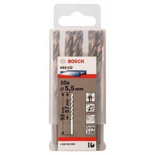 Der HSS-Co Spiralbohrer hat beim Bohren von rostfreiem Stahl eine lange Lebensdauer. Für diese verlängerte Lebensdauer sorgen die Metalllegierung mit 5 % Cobaltgehalt und der aus dem Vollen geschliffene HSS-Stahl mit ausgezeichneter Oberflächengüte, Verschleißfestigkeit und Hitzeschutz. Die zwei Schneidekanten und zwei Spiralnuten entfernen das Spangut schnell und verlängern damit zusätzlich die Lebensdauer. Dieser Bohrer bohrt legierten und unlegierten Stahl, rostfreien Stahl, Gusseisen, Gussstahl sowie säure- und hitzebeständigen Stahl. Der HSS-Co Spiralbohrer wird nach DIN 338 gefertigt. Er gehört zum Bohrertyp N (kleiner Seitenspanwinkel) mit Bohrspitze 135 Grad und Durchmessertoleranz h8. Die Bohrspitze mit Kreuzanschliff ermöglicht aktiven Bohransatz und perfektes Zentrieren ohne Wandern.