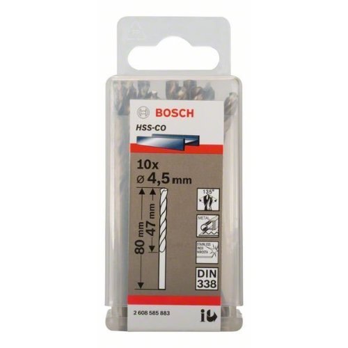 Der HSS-Co Spiralbohrer hat beim Bohren von rostfreiem Stahl eine lange Lebensdauer. Für diese verlängerte Lebensdauer sorgen die Metalllegierung mit 5 % Cobaltgehalt und der aus dem Vollen geschliffene HSS-Stahl mit ausgezeichneter Oberflächengüte, Verschleißfestigkeit und Hitzeschutz. Die zwei Schneidekanten und zwei Spiralnuten entfernen das Spangut schnell und verlängern damit zusätzlich die Lebensdauer. Dieser Bohrer bohrt legierten und unlegierten Stahl, rostfreien Stahl, Gusseisen, Gussstahl sowie säure- und hitzebeständigen Stahl. Der HSS-Co Spiralbohrer wird nach DIN 338 gefertigt. Er gehört zum Bohrertyp N (kleiner Seitenspanwinkel) mit Bohrspitze 135 Grad und Durchmessertoleranz h8. Die Bohrspitze mit Kreuzanschliff ermöglicht aktiven Bohransatz und perfektes Zentrieren ohne Wandern.