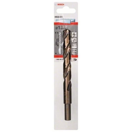 Der HSS-Co Spiralbohrer hat beim Bohren von rostfreiem Stahl eine lange Lebensdauer. Für diese verlängerte Lebensdauer sorgen die Metalllegierung mit 5 % Cobaltgehalt und der aus dem Vollen geschliffene HSS-Stahl mit ausgezeichneter Oberflächengüte, Verschleißfestigkeit und Hitzeschutz. Die zwei Schneidekanten und zwei Spiralnuten entfernen das Spangut schnell und verlängern damit zusätzlich die Lebensdauer. Dieser Bohrer bohrt legierten und unlegierten Stahl, rostfreien Stahl, Gusseisen, Gussstahl sowie säure- und hitzebeständigen Stahl. Der HSS-Co Spiralbohrer wird nach DIN 338 gefertigt. Er gehört zum Bohrertyp N (kleiner Seitenspanwinkel) mit Bohrspitze 135 Grad und Durchmessertoleranz h8. Die Bohrspitze mit Kreuzanschliff ermöglicht aktiven Bohransatz und perfektes Zentrieren ohne Wandern.