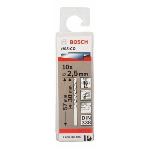 Der HSS-Co Spiralbohrer hat beim Bohren von rostfreiem Stahl eine lange Lebensdauer. Für diese verlängerte Lebensdauer sorgen die Metalllegierung mit 5 % Cobaltgehalt und der aus dem Vollen geschliffene HSS-Stahl mit ausgezeichneter Oberflächengüte, Verschleißfestigkeit und Hitzeschutz. Die zwei Schneidekanten und zwei Spiralnuten entfernen das Spangut schnell und verlängern damit zusätzlich die Lebensdauer. Dieser Bohrer bohrt legierten und unlegierten Stahl, rostfreien Stahl, Gusseisen, Gussstahl sowie säure- und hitzebeständigen Stahl. Der HSS-Co Spiralbohrer wird nach DIN 338 gefertigt. Er gehört zum Bohrertyp N (kleiner Seitenspanwinkel) mit Bohrspitze 135 Grad und Durchmessertoleranz h8. Die Bohrspitze mit Kreuzanschliff ermöglicht aktiven Bohransatz und perfektes Zentrieren ohne Wandern.