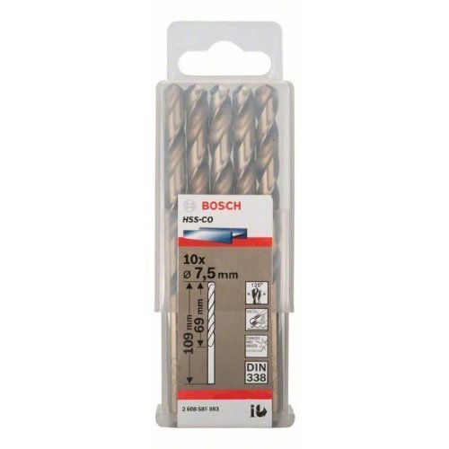 Der HSS-Co Spiralbohrer hat beim Bohren von rostfreiem Stahl eine lange Lebensdauer. Für diese verlängerte Lebensdauer sorgen die Metalllegierung mit 5 % Cobaltgehalt und der aus dem Vollen geschliffene HSS-Stahl mit ausgezeichneter Oberflächengüte, Verschleißfestigkeit und Hitzeschutz. Die zwei Schneidekanten und zwei Spiralnuten entfernen das Spangut schnell und verlängern damit zusätzlich die Lebensdauer. Dieser Bohrer bohrt legierten und unlegierten Stahl, rostfreien Stahl, Gusseisen, Gussstahl sowie säure- und hitzebeständigen Stahl. Der HSS-Co Spiralbohrer wird nach DIN 338 gefertigt. Er gehört zum Bohrertyp N (kleiner Seitenspanwinkel) mit Bohrspitze 135 Grad und Durchmessertoleranz h8. Die Bohrspitze mit Kreuzanschliff ermöglicht aktiven Bohransatz und perfektes Zentrieren ohne Wandern.