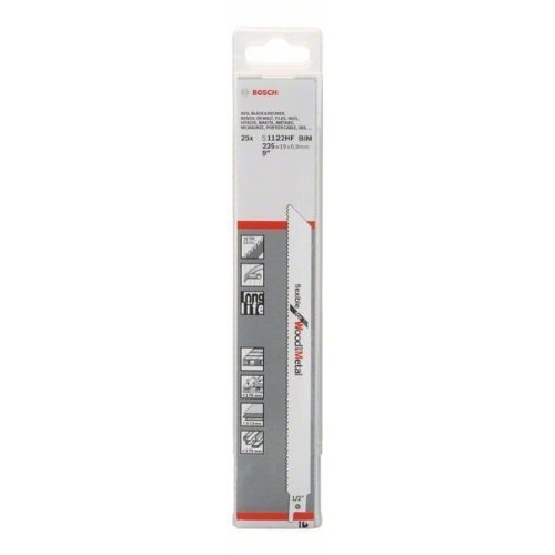 Das S 1122 HF Flexible for Wood and Metal Säbelsägeblatt eignet sich für bündige Schnitte in Holz und Metall. Die Standard-Wandstärke (0,9 mm) mit einer Standardlänge (225 mm) ermöglicht bündiges Schneiden. Zudem kombiniert die Bimetallbasis ein Blatt aus HCS-Stahl (Stahl mit hohem Kohlenstoffgehalt) mit einer HSS-Zahnleiste (Schnellarbeitsstahl), weswegen das Säbelsägeblatt ideal für das Bearbeiten von Paletten ist. Die mittlere Zahnteilung (2,5 mm) schneidet alle weichen Nägel und Befestigungen, die bei Palettenkonstruktionen üblich sind. Es verfügt über eine Standardlänge von 225 mm mit einer Schnittleistung von bis zu 175 mm.