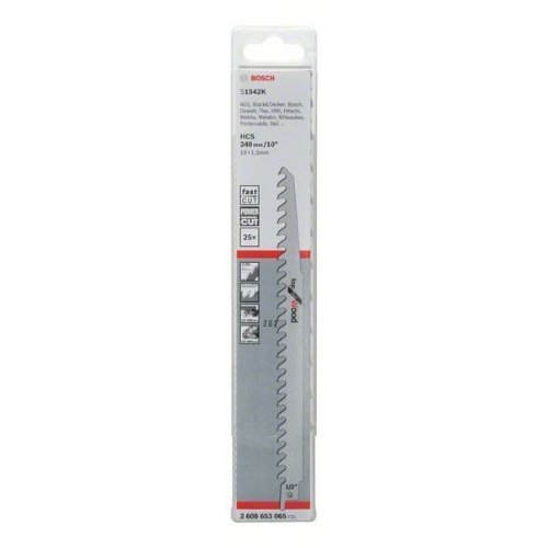 Das S 1542 K Top for Wood Säbelsägeblatt ermöglicht leistungsstarke und schnelle Schnitte in Holz. Die große Zahnteilung (8,5 mm) und die großen Spanräume entfernen Material schnell und effizient. Die scharfgeschliffenen, geschränkten Zähne schneiden schnell und effizient, während die dicke Wandstärke (1,5 mm) ultimative Stabilität für starke Schnitte bietet. Das Säbelsägeblatt aus HCS-Stahl (Stahl mit hohem Kohlenstoffgehalt) eignet sich für das Schneiden von weichem Holz, Bauholz und allen nichtabrasiven Holzwerkstoffen bei Bauarbeiten. Es verfügt über eine lange Länge von 240 mm, die eine Schnittleistung von bis zu 190 mm ermöglicht.