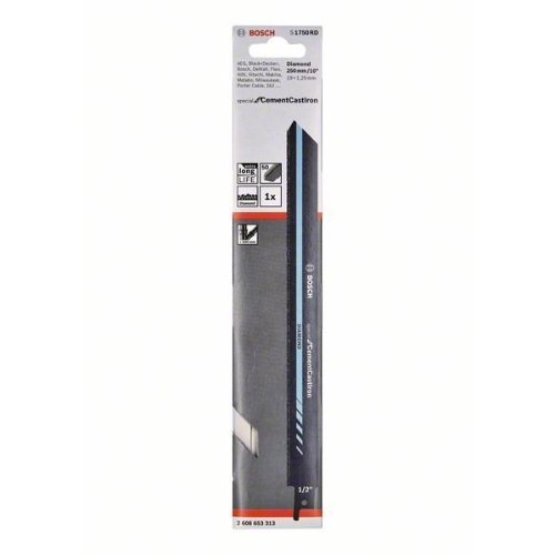 Das S 1750 RD Special für CementCastIron ist die einzige Blatt von Bosch auf dem Markt, das Rohre aus zementiertem Gusseisen schneiden kann. Die feine Diamantbesatz mit Körnung 50 ist auf das Blatt geschweißt und sorgt für eine besonders lange Lebensdauer. Er macht als einzige Säbelsystemlösung das Schneiden von zementiertem Gusseisen möglich. Der 1,25 mm dicke Körper und die Schnittleistung von 250 mm bieten die optimale Stabilität und Festigkeit, die für Schnitte in Rohre mit einem Durchmesser von bis zu 200 mm erforderlich sind.