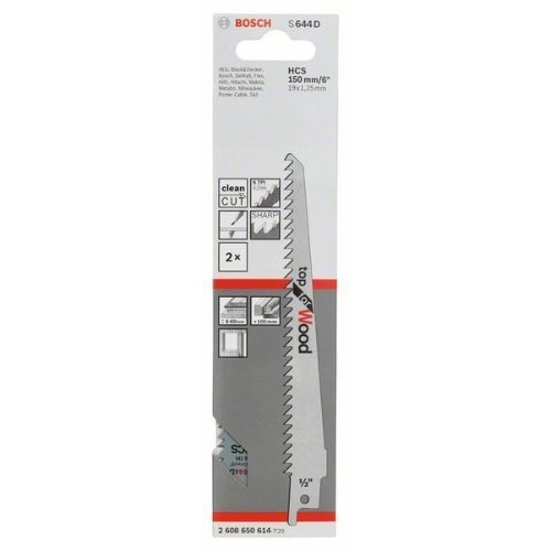Das S 644 D Top for Wood Säbelsägeblatt macht saubere Kurven- und Tauchschnitte in Holz. Die scharfgeschliffenen Zähne sorgen für ausrissfreie Schnitte. Das sich vollständig verjüngte Blatt ermöglicht außerdem einfachen Zugang zu schwer erreichbaren Stellen und macht Kurvenschnitte möglich. Die geschliffene Spitze ist speziell für Tauchschnitte vorgesehen. Das Blatt aus HCS-Stahl (Stahl mit hohem Kohlenstoffgehalt) eignet sich für das Schneiden von weichem Holz, Bauholz und allen nichtabrasiven Holzwerkstoffen bei Bauarbeiten. Es verfügt über eine Standardlänge von 150 mm, die eine Schnittleistung von bis zu 100 mm ermöglicht.