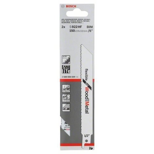 Das S 922 HF Flexible for Wood and Metal Säbelsägeblatt macht bündige Schnitte in Holz und Metall. Die gefrästen, geschränkten Zähne machen das Blatt ideal für Schnitte ohne besondere Anforderungen. Das Bimetallblatt ist zudem für das Schneiden von weichen Nägeln, Baustahl und NE-Metallkomponenten in Holz optimiert. Die Standardlänge (150 mm) ermöglicht eine Schnittleistung von bis zu 100 mm.