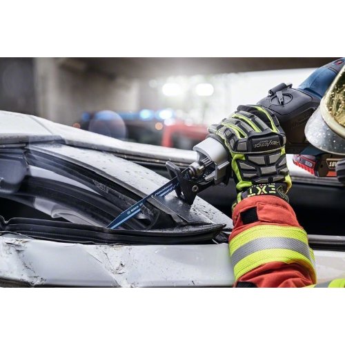 Das S 957 CHM Endurance for Vehicle Rescue Säbelsägeblatt bietet eine ultimative Blattlebensdauer und starke Schnitte in Automobilstahl. Carbide-Zähne ermöglichen höchste Belastbarkeit bei Rettungsarbeiten und beim Zerlegen von Fahrzeugen. Die dicke Wandstärke (1,35 mm) bietet exzellente Stabilität bei Metalldemontage; der verjüngte Körper und der hinterschliffene erste Zahn ermöglichen Tauchschnitte. Die Zähne werden mit der Carbide Technology an den hochelastischen Stahlkörper geschweißt. Das Blatt ist sogar zum Schneiden von härtesten Materialien geeignet. Die mittlere Zahnteilung (3 mm) ist ideal zum Schneiden von A-, B- und C-Fahrzeugsäulen. Die Standardlänge (150 mm) schneidet bis zu 100 mm tief. Das Blatt ideal für Windschutzscheiben, Dächer und sogenannte "dritte Türen".