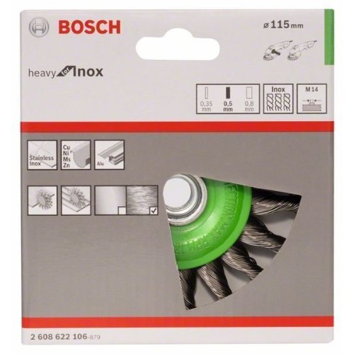 Die Scheibenbürste Heavy for Inox liefert ein besonders grobes Oberflächenfinish. Sie ist mit gezopftem Draht ausgestattet und für schwere Reinigungsarbeiten an kleinen Oberflächen geeignet sowie ideal zum Säubern von Schweißnähten. Sie ist für Reinigungsarbeiten mit hoher Drehzahl an kleineren Oberflächen sowie Kanten und Fugen geeignet. Die Scheibenbürste ist auch geeignet zum Entfernen von starkem Rostbesatz, Farbe, Schlacke, Graten und Zunder von rostfreiem Stahl, Aluminium und anderen Nichteisenmetallen. Drahtbüsten werden in verschiedenen Stärken für verschiedene Schleifgrade angeboten. Stärkerer Draht arbeitet intensiver und schafft schnell Oberflächen, die allerdings grob sind. Dünnerer Draht sorgt für feinere und glattere Oberflächen.