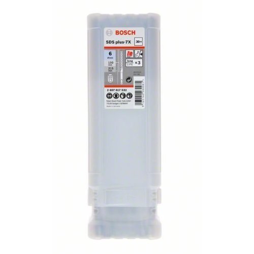 Der SDS plus-7X Bohrer bietet eine hervorragende Nutzungsdauer beim Bohren in armierten Beton. Sein 4-Schneider-Vollkopf besteht aus höchstqualitativem Carbide, wodurch der Kopf verstärkt wird und eine außergewöhnliche Schlagfestigkeit entsteht. Seine durchgängige Verteilung der Bohrkraft garantiert, dass kein Leistungsverlust auftritt, womit die Gesamtlebensdauer erhöht wird. Die einzigartige Diffusionsschweißtechnologie (IDS) von Bosch bietet starken Halt zwischen Kopf und Hals. Darüber hinaus reduziert das 4-spiralige Design mit breiten Kanälen den Verschleiß am Bohrer, indem ein effektiver Bohrmehlabtransport gewährleistet wird. Dieser Bohrer ist für den Einsatz für Bohrhämmer in Mauerwerk, Beton und armierten Beton vorgesehen. Um präzise Ergebnisse zu erzielen, ist anhand der Verschleißkennzeichnung zu erkennen, ob der Lochdurchmesser noch innerhalb der Toleranz für die Dübel liegt. Als Qualitätsbeleg trägt der Bohrer das Qualitätstestzeichen von PGM Masonry Drill Bit Association Board, das Konformität mit strengen Toleranzen, präzises Bohren und einen festen Halt der Befestigungsmaterialien garantiert. Er wird in Deutschland hergestellt.