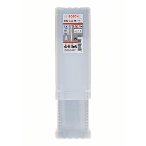 Der SDS plus-7X Bohrer bietet eine hervorragende Nutzungsdauer beim Bohren in armierten Beton. Sein 4-Schneider-Vollkopf besteht aus höchstqualitativem Carbide, wodurch der Kopf verstärkt wird und eine außergewöhnliche Schlagfestigkeit entsteht. Seine durchgängige Verteilung der Bohrkraft garantiert, dass kein Leistungsverlust auftritt, womit die Gesamtlebensdauer erhöht wird. Die einzigartige Diffusionsschweißtechnologie (IDS) von Bosch bietet starken Halt zwischen Kopf und Hals. Darüber hinaus reduziert das 4-spiralige Design mit breiten Kanälen den Verschleiß am Bohrer, indem ein effektiver Bohrmehlabtransport gewährleistet wird. Dieser Bohrer ist für den Einsatz für Bohrhämmer in Mauerwerk, Beton und armierten Beton vorgesehen. Um präzise Ergebnisse zu erzielen, ist anhand der Verschleißkennzeichnung zu erkennen, ob der Lochdurchmesser noch innerhalb der Toleranz für die Dübel liegt. Als Qualitätsbeleg trägt der Bohrer das Qualitätstestzeichen von PGM Masonry Drill Bit Association Board, das Konformität mit strengen Toleranzen, präzises Bohren und einen festen Halt der Befestigungsmaterialien garantiert. Er wird in Deutschland hergestellt.