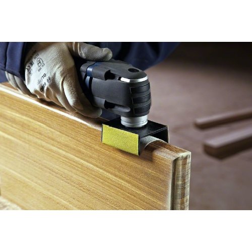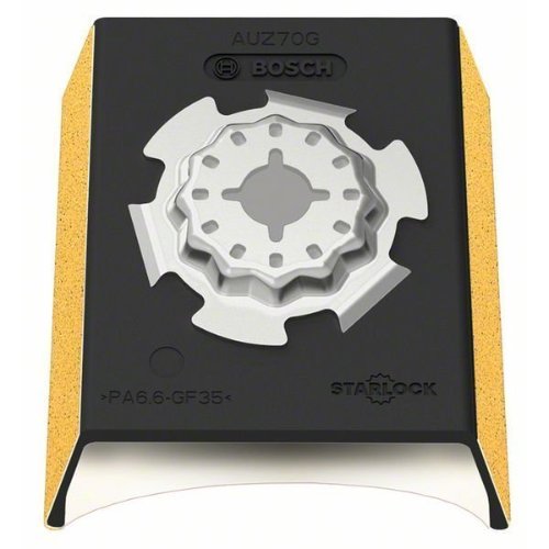 Der Profilschleifer Starlock AUZ 70 G ermöglicht komfortables Schleifen von gerundetem Materialoberflächen. Seine Platte besitzt ein Klettverschluss-Befestigungssystem und Velours für einfache Blattwechsel. Die flexible und anpassungsfähige Aufnahmefläche des Blattes ermöglicht das einfache Schleifen unterschiedlich ausgeformter Materialoberflächen. Sie ermöglicht komfortables Schleifen gerundeter und unebener Oberflächen bis zu einem Durchmesser von 55 mm. Mit der Platte lassen sich gerundete oder gebogene Oberflächen aus Holz, Farbe, Lack oder faserverstärktem Verbundwerkstoff schleifen. Der Profilschleifer wird mit vier Blatt (70 mm x 125 mm) Schleifpapier mit Klettrückseite geliefert. Das Aufnahmesystem ermöglicht durch seine dreidimensionale enge Passung maximale Kraftübertragung zwischen Maschine und Zubehör.