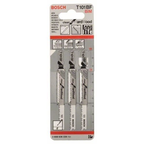 Das T 101 BF Clean for Hard Wood Stichsägeblatt macht saubere gerade Schnitte in Holz. Die präzisionsgeschliffenen Zähne mit Kegelschliffkörper schneiden sauber. Die Zahnleiste aus gehärtetem HSS (Hochgeschwindigkeitsstahl) und BIM (Bimetall) ist mit hochelastischem HCS (Kohlenstoffstahl) verstärkt, wodurch das Blatt zum Schneiden von harten Materialien, wie Hartholz und abrasiven Holzwerkstoffen, geeignet ist. Es ist mit einer fein progressiven Zahnteilung (2,7 mm) ausgestattet, um eine Vielzahl an Holzmaterialien mit einer Dicke von 3-30 mm zu schneiden.