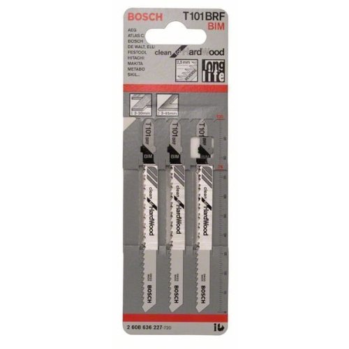 Das T 101 BRF Clean for Hard Wood Stichsägeblatt macht saubere gerade Schnitte in Holz. Die präzisionsgeschliffenen Zähne mit Kegelschliffkörper schneiden sauber. Die Zahnleiste aus gehärtetem HSS (Hochgeschwindigkeitsstahl) und BIM (Bimetall) ist mit hochelastischem HCS (Kohlenstoffstahl) verstärkt, wodurch das Blatt zum Schneiden von harten Materialien, wie Hartholz und abrasiven Holzwerkstoffen, geeignet ist. Außerdem ist es mit einer Reverse-Zahnform ausgestattet, die ausrissfreie Schnitte an der Oberseite ermöglicht. Die feine Zahnteilung (2,5 mm) zum Schneiden von Holzmaterialien mit einer Dicke von 3-30 mm.