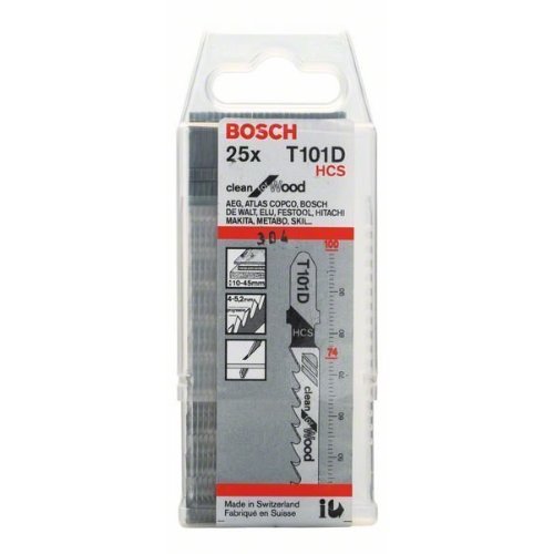 Das T 101 D Clean for Wood Stichsägeblatt macht saubere gerade Schnitte in Holz. Die präzisionsgeschliffenen Zähne mit Kegelschliffkörper bringen saubere Ergebnisse. Das Blatt aus Kohlenstoffstahl ist zum Schneiden von Weichholz und nicht-abrasiven Holzwerkstoffen geeignet. Es ist mit einer großen progressiven Zahnteilung (4-5,2 mm) ausgestattet, um Holzmaterialien mit einer Dicke von 10-45 mm zu schneiden.