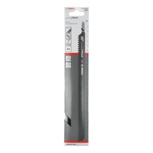 Das T 1044 DP Precision for Wood Stichsägeblatt macht präzise, schnelle gerade Schnitte in Holz. Die erhöhte Stärke des Blatts verhindert Verbiegen und ermöglicht präzise, winkelhaltige Schnitte. Die scharfgeschliffenen Zähne des Blatts sind geschränkt, wodurch schnelle Schnitte ermöglicht werden. Das Blatt aus HCS (Kohlenstoffstahl) ist zum Schneiden von Weichholz und nicht abrasiven Holzwerkstoffen geeignet. Es ist mit einer großen Zahnteilung (4 mm) und einer besonders großen Länge von 250 mm ausgestattet, um Holzmaterialien mit einer Dicke von bis zu 160 mm zu schneiden.