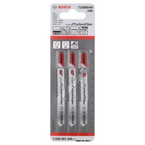 Das T 108 BHM Clean for Carbon Fibre Stichsägeblatt ist besonders robust bei sauberen geraden Schnitten in Kunststoff. Die geschliffene Zahnleiste ist für die längere Nutzung mit abrasiven Kunststoff-Verbundwerkstoffen konzipiert, während die Zahngeometrie dafür da ist, Abblättern und Ablösen beim Schneiden von Kohlefaser zu vermeiden. Die Zahnleiste ist zudem mit der Carbide Technology an einen hochelastischen Kohlenstoffstahlkörper geschweißt, wodurch das Blatt durch sehr robuste Materialien, wie z. B. abrasive Kunststoff-Verbundwerkstoffe, wie Kohlefaser- und Glasfaserlaminate, schneiden kann. Es zeichnet sich durch eine feinen Zahnteilung (2,2 mm) aus und schneidet Kohlefaser- und Glasfaserverbundplatten, Profile und massive Stäbe mit einer Dicke bis zu 20 mm.