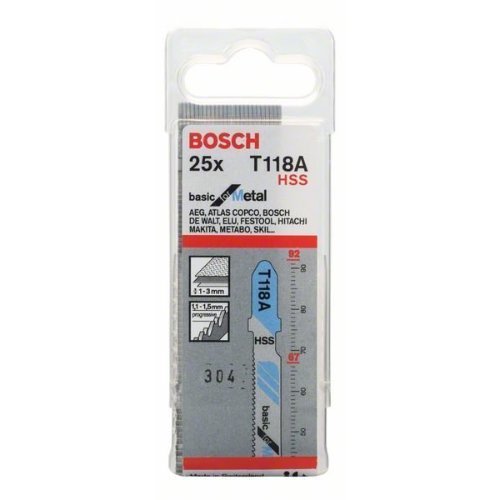Das T 118 A Basic for Metal Stichsägeblatt macht gerade Schnitte in Metall. Die gefrästen, gewellten Zähne sind ideal für Schnitte ohne besondere Anforderungen. Das Blatt aus hochwertigem gehärtetem HSS (Hochgeschwindigkeitsstahl) ist zum Schneiden von nicht perforierten Metallblechen mit Standard-Stärke geeignet. Die sehr fein progressive Zahnteilung des Blatts (1,1-1,5 mm) ermöglicht es, eine Vielzahl an sehr dünnen massiven Metallblechen mit einer Dicke von 1-3 mm zu schneiden.