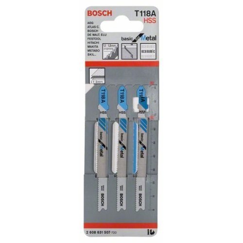 Das T 118 A Basic for Metal Stichsägeblatt macht gerade Schnitte in Metall. Die gefrästen, gewellten Zähne sind ideal für Schnitte ohne besondere Anforderungen. Das Blatt aus hochwertigem gehärtetem HSS (Hochgeschwindigkeitsstahl) ist zum Schneiden von nicht perforierten Metallblechen mit Standard-Stärke geeignet. Die sehr fein progressive Zahnteilung des Blatts (1,1-1,5 mm) ermöglicht es, eine Vielzahl an sehr dünnen massiven Metallblechen mit einer Dicke von 1-3 mm zu schneiden.