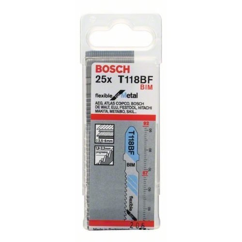 Das T 118 BF Flexible for Metal Stichsägeblatt ist bruchfest beim geraden Schneiden in Metall. Die gefrästen, gewellten Zähne sind zum Schneiden von Metallblech konzipiert. Die Zahnleiste aus gehärtetem HSS (Hochgeschwindigkeitsstahl) und BIM (Bimetall) ist mit hochelastischem HCS (Kohlenstoffstahl) verstärkt, wodurch das Bruchrisiko reduziert wird, und sowohl genügend Festigkeit als auch Flexibilität geboten werden, die beide erforderlich sind, um perforiertes Metallblech aus Stahl (Standard-Stärke) zu schneiden. Das Blatt ist mit einer feinen progressiven Zahnteilung (1,9-2,3 mm) ausgestattet und schneidet eine Vielzahl an mittelstarken Metallblechen mit einer Dicke von 2,5-6 mm.
