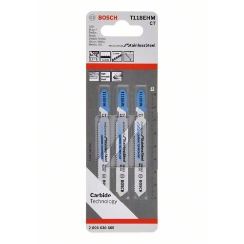 Das T 118 EHM Endurance for Stainless Steel Stichsägeblatt ist besonders robust bei geraden Schnitten in Metall. Die geschliffene Zahnleiste ist für eine lange Lebensdauer beim Schneiden von mittelstarkem Edelstahl konzipiert. Die Zahnleiste ist zudem mit der Carbide Technology an einen hochelastischen Kohlenstoffstahlkörper geschweißt, wodurch das Blatt durch sehr robuste Materialien, wie z. B. hochfesten Stahl, schneiden kann. Die feine Zahnteilung (1,4 mm) ermöglicht es, mittelstarke Edelstahlbleche mit einer Dicke von 2-5 mm zu schneiden.
