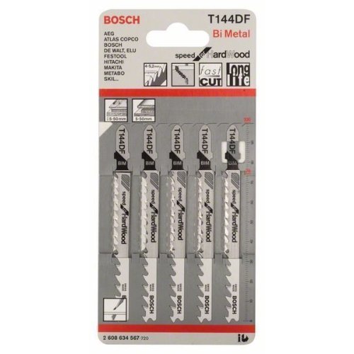 Das T 144 DF Speed for Hard Wood Stichsägeblatt macht schnelle gerade Schnitte in Holz. Die scharfgeschliffenen Zähne sind geschränkt, wodurch schnelle Schnitte ermöglicht werden. Die Zahnleiste aus gehärtetem HSS (Hochgeschwindigkeitsstahl) und BIM (Bimetall) ist mit hochelastischem HCS (Kohlenstoffstahl) verstärkt, wodurch das Blatt zum Schneiden von harten Materialien, wie Hartholz und abrasiven Holzwerkstoffen, geeignet ist. Dieses Produkt verfügt über eine große progressive Zahnteilung (4-5,2 mm) und schneidet eine Vielzahl an Massivholzmaterialien mit einer Dicke von 5-50 mm.