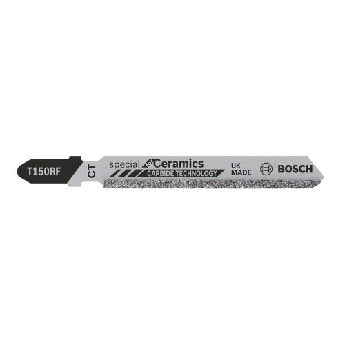 Das T 150 RIFF Special for Ceramics Stichsägeblatt ist besonders robust bei sauberen geraden Schnitten in Sonderwerkstoffen. Der feingeschliffene Carbide-Korn ist für wiederholte feine Anpassungsschnitte in abrasiven Keramikmaterialien konzipiert. Die Zahnleiste ist zudem mit der Carbide Technology an einen hochelastischen Kohlenstoffstahlkörper geschweißt, wodurch das Blatt durch sehr robuste Materialien, wie z. B. Wandfliesen in Keramik, schneiden kann. Der feingeschliffene Carbide-Korn (K50) schneidet weiche Wandfliesen aus Keramik mit einer Dicke von 5-10 mm.