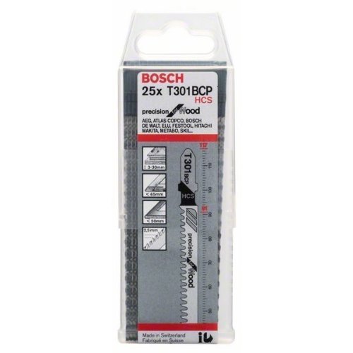 Das T 301 BCP Precision for Wood Stichsägeblatt macht präzise, saubere gerade Schnitte in Holz. Die erhöhte Stärke des Blatts verhindert Verbiegen und ermöglicht präzise, winkelhaltige Schnitte. Die präzisionsgeschliffenen Zähne des Blatts mit Kegelschliffkörper ermöglichen außerdem saubere Schnitte. Das Blatt aus Kohlenstoffstahl ist zum Schneiden von Weichholz und nicht-abrasiven Holzwerkstoffen geeignet. Es ist mit einer feinen Zahnteilung (2,5 mm) und einer großen Länge (117 mm) ausgestattet, um Holzmaterialien mit einer Dicke von 3-65 mm zu schneiden.