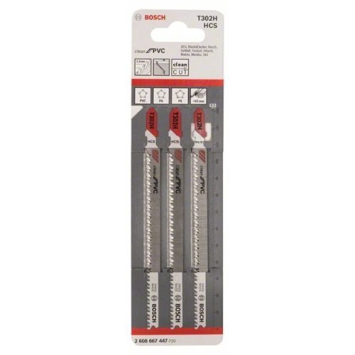 Das T 302 H Clean for PVC Stichsägeblatt macht saubere gerade Schnitte in den Kunststoff. Die präzisionsgeschliffenen Zähne mit Kegelschliffkörper schneiden sauber, während die Zahngeometrie so konzipiert ist, dass sie Schmelzen und ständige Spanbildung beim Schneiden von PVC verhindert. Das Blatt aus Kohlenstoffstahl (HCS) ist zum Schneiden von nicht-abrasiven Thermoplast-Kunststoffen geeignet. Es ist mit einer feinen Zahnteilung (2,3 mm) zum Schneiden von Kunststoffplatten mit einer Dicke von 3-30 mm ausgestattet, während die große Länge (132 mm) Kunststoffrohre, -profile und massive Stäbe mit einem Durchmesser bis zu 65 mm schneidet.