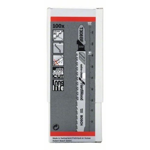 Das T 308 BF Extra-Clean for Hard Wood Stichsägeblatt macht besonders saubere gerade Schnitte in Holz. Die präzisionsgeschliffenen Zähne mit Kegelschliffkörper schneiden sauber. Zwei in verschiedenen Winkeln angeordnete Zahnreihen ermöglichen außerdem ausrissfreie Schnitte an Ober- und Unterseite. Die Zahnleiste aus gehärtetem HSS (Hochgeschwindigkeitsstahl) und BIM (Bimetall) ist mit hochelastischem HCS (Kohlenstoffstahl) verstärkt, wodurch das Blatt zum Schneiden von harten Materialien, wie Hartholz und abrasiven Holzwerkstoffen, geeignet ist. Es ist mit einer 2,2XC Zahngeometrie, einer feinen Zahnteilung (2,2 mm) und einer großen Länge (117 mm) ausgestattet, um Massivholzmaterialien mit einer Dicke von 5-50 mm zu schneiden.