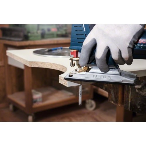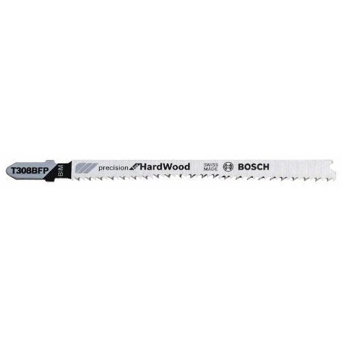 Das T 308 BFP Precision for Hard Wood Stichsägeblatt macht präzise, saubere gerade Schnitte in Holz. Die erhöhte Stärke des Blatts verhindert Verbiegen und ermöglicht präzise, winkelhaltige Schnitte. Die präzisionsgeschliffenen Zähne mit Kegelschliffkörper schneiden sauber, während zwei in verschiedenen Winkeln angeordnete Zahnreihen ausrissfreie Schnitte an Ober- und Unterseite ermöglichen. Die Zahnleiste aus gehärtetem HSS (Hochgeschwindigkeitsstahl) und BIM (Bimetall) ist mit hochelastischem HCS (Kohlenstoffstahl) verstärkt, wodurch das Blatt zum Schneiden von harten Materialien, wie Hartholz und abrasiven Holzwerkstoffen, geeignet ist. Es ist mit einer 2,2XC Zahngeometrie, einer feinen Zahnteilung (2,2mm) und einer großen Länge (117mm) ausgestattet, um Massivholzmaterialien mit einer Dicke von 5-50mm zu schneiden.
