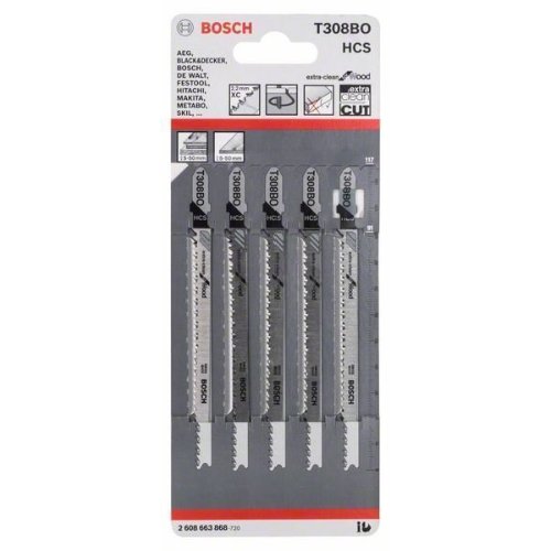 Das T 308 BO Extra-Clean for Wood Stichsägeblatt macht besonders saubere Kurvenschnitte in Holz. Die präzisionsgeschliffenen Zähne mit Kegelschliffkörper schneiden sauber. Ein schmales Blatt ermöglicht außerdem enge Kurven bei Kurvenschnitten. Ausrissfreie Schnitte an Ober-/Unterseite sind dank der zwei in verschiedenen Winkeln angeordneten Zahnreihen möglich. Das Blatt aus HCS (Kohlenstoffstahl) ist zum Schneiden von Weichholz und nicht abrasiven Holzwerkstoffen geeignet. Es ist mit einer 2,2XC Zahngeometrie, einer feinen Zahnteilung (2,2 mm) und einer großen Länge (117 mm) ausgestattet, um Holzmaterialien mit einer Dicke von 5-50 mm zu schneiden.
