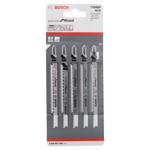 Das T 308 BP Precision for Wood Stichsägeblatt macht präzise, besonders saubere gerade Schnitte in Holz. Die erhöhte Stärke des Blatts verhindert Verbiegen und ermöglicht präzise, winkelhaltige Schnitte. Die präzisionsgeschliffenen Zähne mit Kegelschliffkörper schneiden sauber, während zwei in verschiedenen Winkeln angeordnete Zahnreihen ausrissfreie Schnitte an Ober- und Unterseite ermöglichen. Das Blatt aus HCS (Kohlenstoffstahl) ist zum Schneiden von Weichholz und nicht abrasiven Holzwerkstoffen geeignet. Es ist mit einer 2,2XC Zahngeometrie, einer feinen Zahnteilung (2,2 mm) und einer großen Länge (117 mm) ausgestattet, um Holzmaterialien mit einer Dicke von 5-50 mm zu schneiden.
