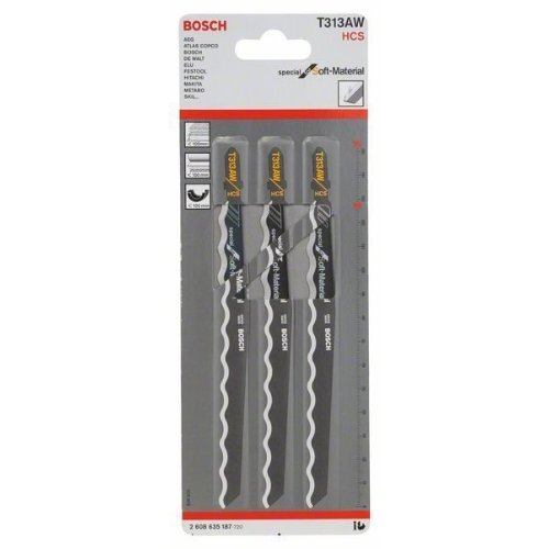 Das T 313 AW Special for Soft Material Stichsägeblatt macht saubere gerade Schnitte in Sonderwerkstoffe. Symmetrisch scharfgeschliffene Messerschneide mit Wellenschliff zum effektiven Schneiden von den meisten weichen Materialien mit wenig Kraftaufwand. Das Blatt aus Kohlenstoffstahl ist zum Schneiden von nicht-abrasiven weichen Materialien, wie z. B. Karton, Styropor, Teppich, Leder, Gummi und vielen weiteren geeignet. Das Blatt ist sehr lang (152 mm) zum Schneiden von biegsamen Materialien mit einer Dicke bis zu 100 mm. Elektrowerkzeuge erfordern viel weniger Kraftaufwand als übliche Handmesser.