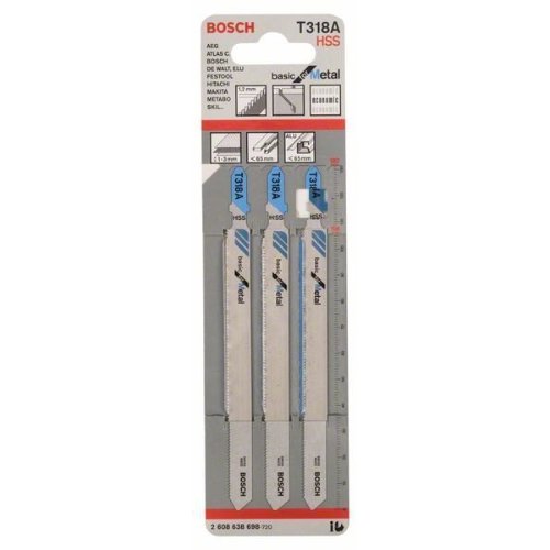 Das T 318 A Basic for Metal Stichsägeblatt macht Schnitte in Metall. Die gefrästen, gewellten Zähne sind ideal für grundlegende Schnitte ohne besondere Anforderungen. Das Blatt aus hochwertigem gehärtetem Hochgeschwindigkeitsstahl ist zum Schneiden von Rohren und geschlossenen Profilen aus Stahl (Standard-Stärke), Aluminium und Nichteisenmetallen geeignet. Die sehr feine Zahnteilung des Blatts (1,2 mm) schneidet dünnwandige Metallrohre und -profile mit 1-3 mm Wanddicke, während die große Länge (132 mm) Rohre und Profile mit einem Durchmesser von bis zu 65 mm schneidet. Für den Gebrauch mit Stichsägen mit T-Schaft-Aufnahme.