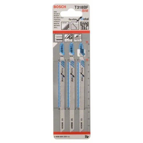 Das T 318 BF Flexible for Metal Stichsägeblatt ist bruchfest beim geraden Schneiden in Metall. Die gefrästen, gewellten Zähne sind zum Schneiden von Metallrohren und -profilen konzipiert. Die Zahnleiste aus gehärtetem HSS (Hochgeschwindigkeitsstahl) und BIM (Bimetall) ist mit hochelastischem HCS (Kohlenstoffstahl) verstärkt, wodurch das Bruchrisiko reduziert wird. Dadurch wird sowohl genügend Festigkeit als auch die erforderliche Flexibilität sichergestellt, um Rohre und offene Metallprofile (z. B. in L-/H-/U-/T-Form) aus Stahl (Standard-Stärke) zu schneiden. Die feine Zahnteilung des Blatts (1,8 mm) schneidet mittelstarke Metallrohre und -profile mit 2,5-6 mm Wanddicke, während die große Länge (132 mm) Rohre und Profile mit einem Durchmesser von bis zu 65 mm schneidet.