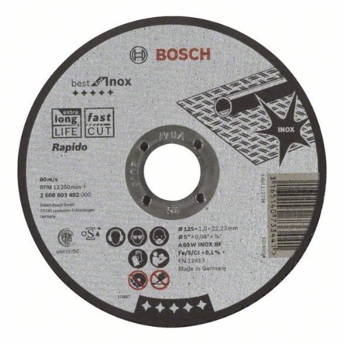 Die Trennscheibe Best for Inox – Rapido gewährleistet schnelle Schnitte in Stahl. Die Scheibe besitzt keramikgekapselte Schleifkörner. Dadurch ist sie besonders verschleißresistent und garantiert gleichmäßig hohe Qualität bei minimaler Gratbildung oder Blauverfärbung. Zudem sorgt die besonders dünne Scheibe für schnelle, präzise und glatte Schnitte in geeigneten Materialien. Die Trennscheibe Best for Inox – Rapido ist frei von Eisen, Schwefel und chlorierten Füllstoffen. Zudem sorgt das präzisionsgefertigte Glasfasergewebe für hohe Stabilität und Sicherheit beim Schneiden. Verwenden Sie diese Scheibe zum Schneiden von Inox. Trennscheiben von Bosch erfüllen die höchsten Sicherheitsanforderungen wie EN 12413, FEPA und oSa.
