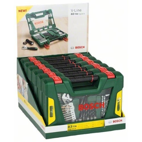 V-Line Box, 83-teilig, 6 x 83-teiliges V-Line Bohrer- und Bit-Set, Inhalt eines Sets: LED-Taschenlampe und Rollgabelschlüssel, 8 Metallbohrer HSS-TiN mit Durchmesser von 2 bis 6 mm, 10 Steinbohrer mit Durchmesser von 3 bis 10 mm, 8 Holzbohrer mit Durchmesser von 3 bis 10 mm, 2 Flachfräsbohrer mit Durchmesser von 16 und 20 mm, 13 Schrauberbits mit Länge: 50 mm, PH 0 / 1 / 2 / 3, PZ 0 / 1 / 2 / 3, S 5, T 15 / 20, H 5 / 6, 32 Schrauberbits mit Länge: 25 mm, PH 0 / 0 / 1 / 1 / 2 / 2 / 3 / 3 , PZ 0 / 0 / 1 / 1 / 2 / 2 / 3 / 3, S 4 / 5 / 6, T 10 / 10 / 15 / 15 / 20 / 20 / 25 / 25 / 30 / 40, H 4 / 5 / 6, 6 Steckschlüssel mit Durchmesser 6 / 7 / 8 / 10 / 12 / 13 mm, Kegelsenker und magnetischer Bithalter.