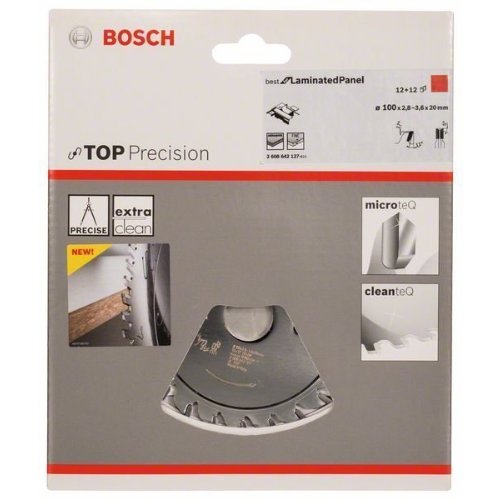 Das Top Precision Best for Laminated Panel Vorritzsägeblatt ermöglicht industriequalitative Präzision für sehr anspruchsvolle Anwendungen bei laminierten Paneelen, die an einer oder zwei Seiten beschichtet sind. Diese hohe Leistung und Qualität werden durch die einzigartigen besonders harten Microteq-Zähne verstärkt, die intern bei Bosch hergestellt werden, und aus robustem Carbide-Korn bestehen. Cleanteq reduziert zudem die Anhaftung von Rückständen, wie z. B. Harz und Klebstoff, um besonders saubere Ergebnisse sicherzustellen, während Korrosion verhindert und das Blatt kühl gehalten wird. Das einstellbare Vorritzsägeblatt ist für das Schneiden von Spanplatten, Paneelmaterialien und furniertem Laminat konzipiert. Das Top Precision Best for Laminated Panel Vorritzsägeblatt verfügt über eine ATB-Zahngeometrie (Wechselzahn), wodurch saubere Schnitte in alle Arten an Holz und laminierten Paneelen ermöglicht werden.