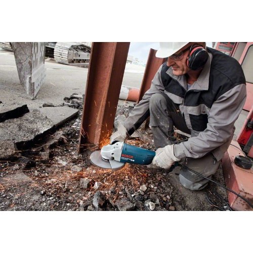 Winkelschleifer GWS 24-230 JH, Der Leistungsstarke mit geringem Gewicht, Leistungsstarker 2.400-Watt Champion-Motor für schnellen Arbeitsfortschritt, Kompakte Bauweise für gute Handhabung und Kontrolle der Maschine, Wiederanlaufschutz verhindert selbstständiges Wiederanlaufen der Maschine nach einer Stromunterbrechung, Zusatzhandgriff (1 602 025 022); Aufnahmeflansch (1 605 703 099); Spannmutter (1 603 340 040); Schutzhaube (2 605 510 298); Zweilochschlüssel (1 607 950 048)