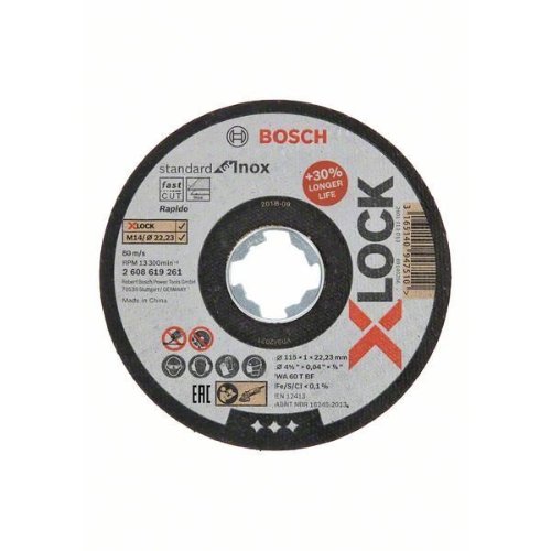 Die X-LOCK Trennscheibe Standard for Inox sorgt für zuverlässige Eigenschaften in Stahl. Die schmale Schneide der Scheibe sorgt für glatte Schnitte ohne großen Kraftaufwand. Zudem ist die Scheibe frei von Eisen, Schwefel und chlorierten Füllstoffen. Trennscheiben von Bosch erfüllen die höchsten Sicherheitsanforderungen wie EN 12413. Dank schlüssellosem X-LOCK System lassen sich die Trennscheiben schnell und bequem wechseln.