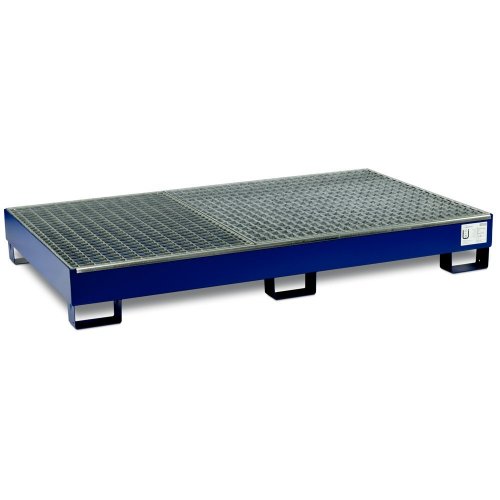 Auffangwanne aus Stahl Typ SW6 mit Gitterrost, lackierte Ausführung, Belastung 2400 kg, Auffangvolumen 308 l, Kapazität 6 Fässer à 200 l, Außenmaße: 201 x 120,5 x 26,6 cm