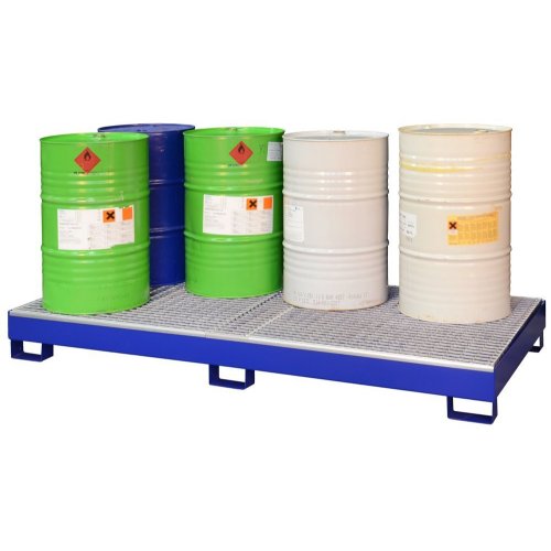 Auffangwanne aus Stahl Typ SW8 mit Gitterrost, lackierte Ausführung, Belastung 3200 kg, Auffangvolumen 205 l, Kapazität 8 Fässer à 200 l, Außenmaße: 239 x 121 x 21 cm
