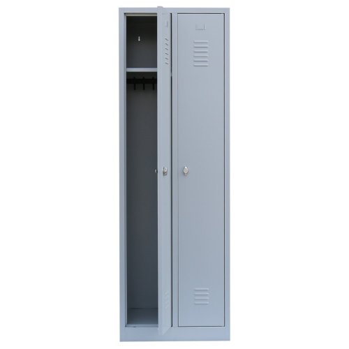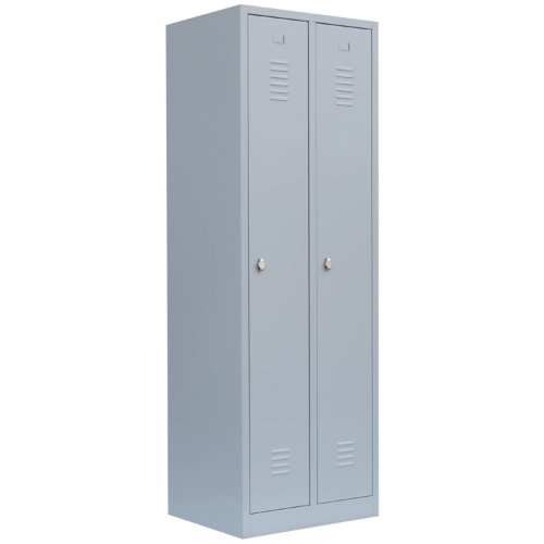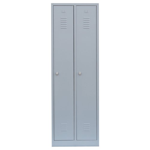 Garderobenspind mit 2 Abteilen, Abteilbreite 300 mm. Stabile, verschweißte Stahlblechkonstruktion. Jedes Abteil mit Hutboden und Kleiderstange, inkl. 3 verschiebbaren Kunststoffhaken. Türen korpusbündig einschlagend, jeweils rechts angeschlagen, an gefederten Stiftscharnieren befestigt. Lüftungsschlitze, eingestanzter Etikettenrahmen H 30 x B 50 mm. Verschließbar durch Drehriegelverschluss für Vorhangschloss (nicht im Lieferumfang enthalten). Pulverbeschichtung: Korpus in RAL 7035 Lichtgrau, Türen in RAL 7035 Lichtgrau. GS zertifiziert. Maße: H 1800 x B 600 x T 500 mm.