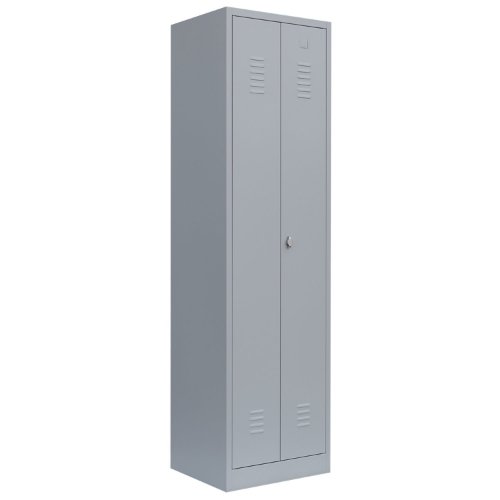 Garderobenspind mit 2 Abteilen, Abteilbreite 300 mm, mittig schliessend . Stabile, verschweißte Stahlblechkonstruktion. Jedes Abteil mit Hutboden und Kleiderstange, inkl. 3 verschiebbaren Kunststoffhaken. Türen korpusbündig einschlagend, rechts und links angeschlagen, an gefederten Stiftscharnieren befestigt. Lüftungsschlitze, eingestanzter Etikettenrahmen H 30 x B 50 mm. Türen mittig verschliessbar durch Drehriegelverschluss für Vorhangschloss (nicht im Lieferumfang enthalten). Pulverbeschichtung: Korpus in RAL 7035 Lichtgrau, Türen in RAL 7035 Lichtgrau. GS-zertifiziert. Maße: H 1800 x B 600 x T 500 mm.