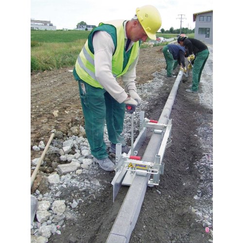 Praktisches Feature: Die DIN schreibt auch die Verdichtung des Betons vor, also liefern wir den Stampfer einschließlich Befestigung an der GR-150 gleich mit! Beim Einbau von Bordsteinen ist nach DIN 18318 zwingend eine geschalte Rückenstütze vorgeschrieben. Um diese Schalung nicht kostenintensiv auf der Baustelle herstellen zu müssen, haben wir eine Gleitschalung mit vielen Finessen entwickelt. Auch anwendbar bei nicht zu engen Kurven.