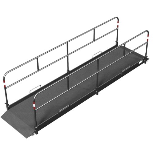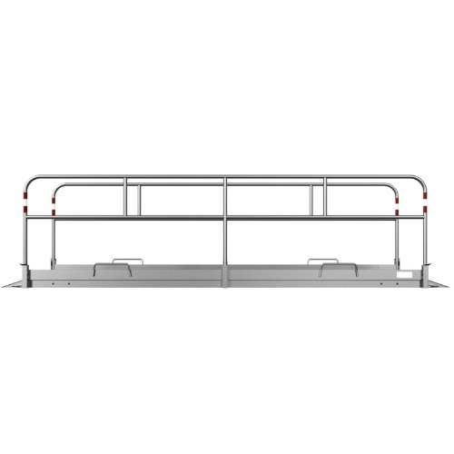 Diese Grabenbrücke aus Aluminium ermöglicht den sicheren Übergang über Gräben und Kanäle. Die Konstruktion besteht komplett aus Aluminium. Der durchgehende Belag aus rutschsicherem Alu-Tränenblech (3/4 mm) sorgt für Halt, auch bei feuchten Bedingungen. Eine integrierte Auffahrrampe erlaubt das stufenlose Passieren mit Rollstühlen und Kinderwagen. Seitliche Alu-Bordbretter sichern den Fußraum und reduzieren das Risiko des Abrutschens. Die Geländer tragen rot-weiß-rote Reflektorstreifen und verbessern die Sichtbarkeit bei Dämmerung. Beidseitig angeschweißte Tragegriffe unterstützen ergonomisches Handling beim Umsetzen. Vier eingearbeitete Stapelwinkel erleichtern den sicheren Transport und eine ordentliche Lagerung. Über vier Ösen kann die Brücke mit Erdnägeln (Art.-Nr. 30W80) gegen Verrutschen fixiert werden. Die Tragfähigkeit liegt bei 200 kg/m². Die Lauffläche bietet eine Breite von 1,00 m, die Gesamtlänge beträgt etwa 4,50 m.